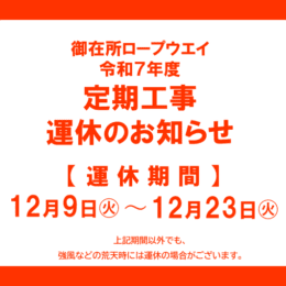 御在所ロープウエイは、下記の期間、定期工事のため運休いたします。 期間:令和7年12日9日(火)~令和7年12月23日(火) 期間中は、…