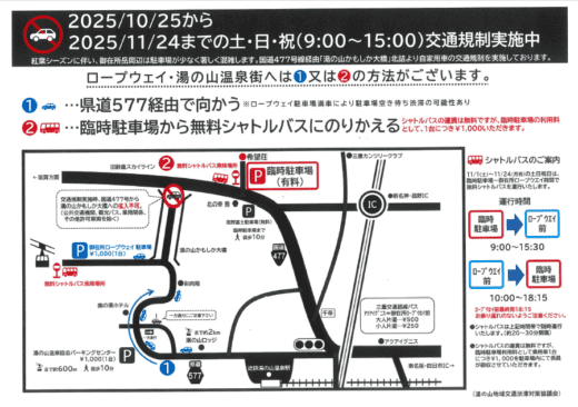 また、規制日以外においてもロープウエイ駐車場が満車の場合は交通規制をさせていただきます。